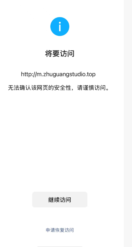 我的服务号网页http://m.zhuguangstudio.top,在微信中打开提示"无法确认该网页的安全性,请谨慎访问"。域名备案正常,浏览器访问正常,网页里没有不安全的内容,腾讯安全-网址安全中心检测也没有发现风险,请核实后帮忙解除拦截,谢谢!另外为什么会出现这种情况,请帮忙查一下,万分感谢!