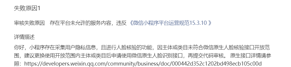 我们的小程序是访客预约,需要访客上传一张照片进行预约,预约通过后,到现场通过刷脸机刷脸进入厂区,发布小程序一直审核不通过,怎么处理呀?