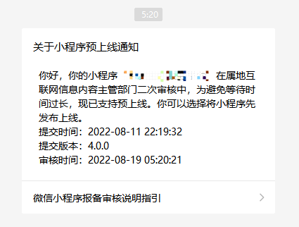 你好,小程序收到预上线通知后,可支持先发布上线。后续版本迭代如无新增需报备类目,资质类目无问题,无网信办相关通知,则无需二次进入网信办报备流程。