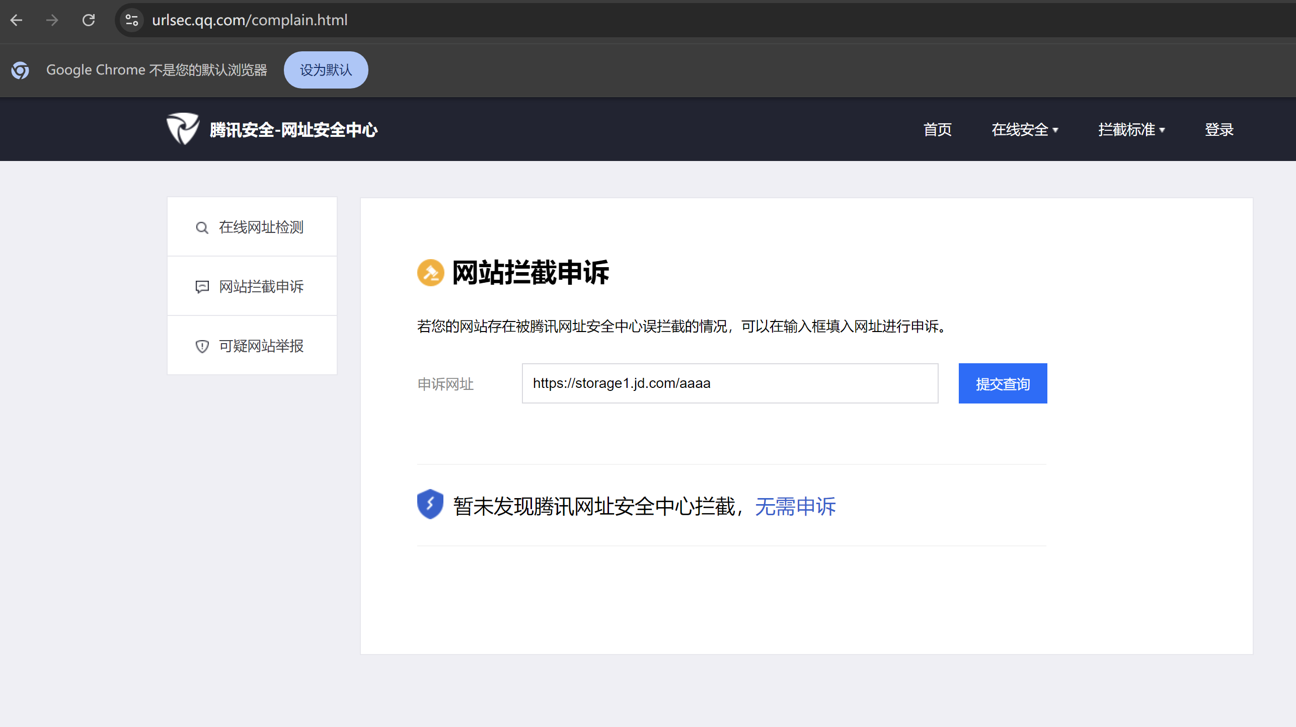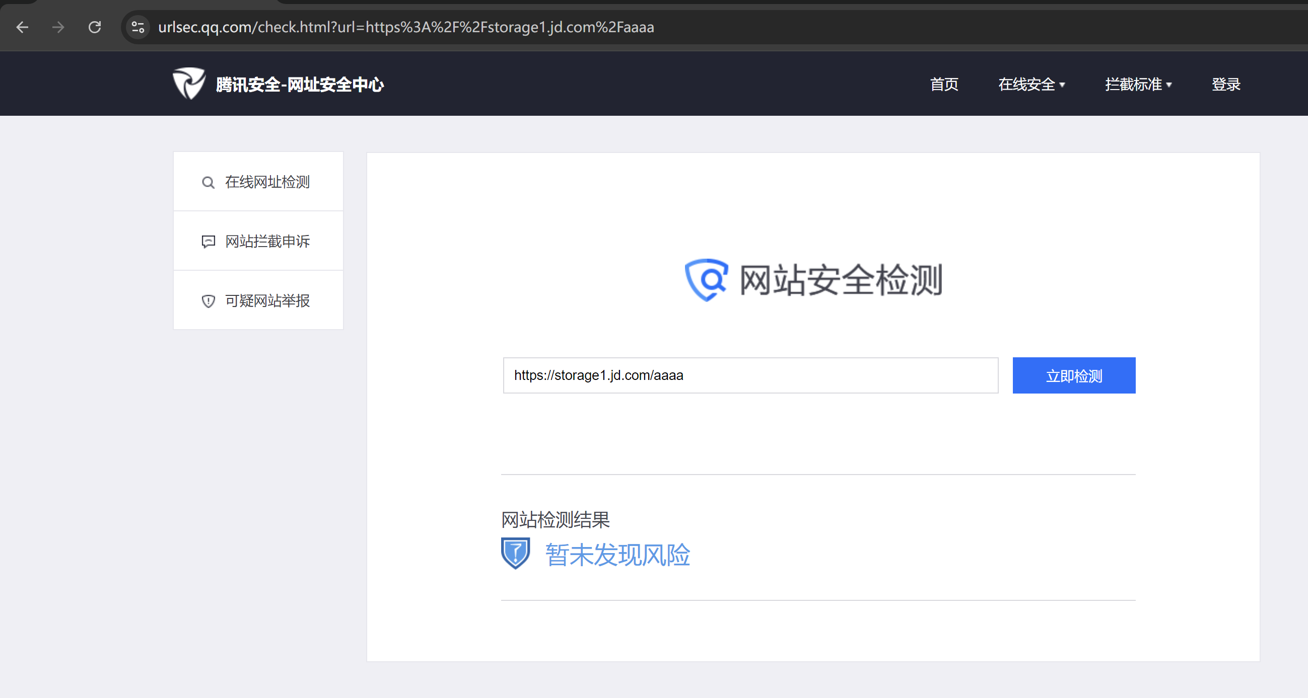 尊敬的审核员,网站 http://storage1.jd.com/* ; http://storage2.jd.com/* ;http://storage3.jd.com/*;http://storage4.jd.com/*;http://storage5.jd.com/*;http://storage6.jd.com/*;http://dd-static.jd.com/* 通过腾讯安全检测未发现异常,希望贵公司能解除网站目录拦截,在此诚恳感谢