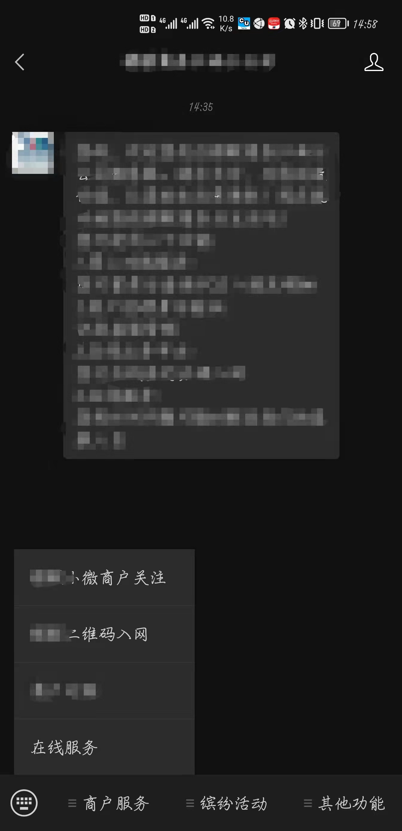 这是现有的公众号页面,可以看到主菜单有“商户服务”、“缤纷活动”、“其他功能”三个。