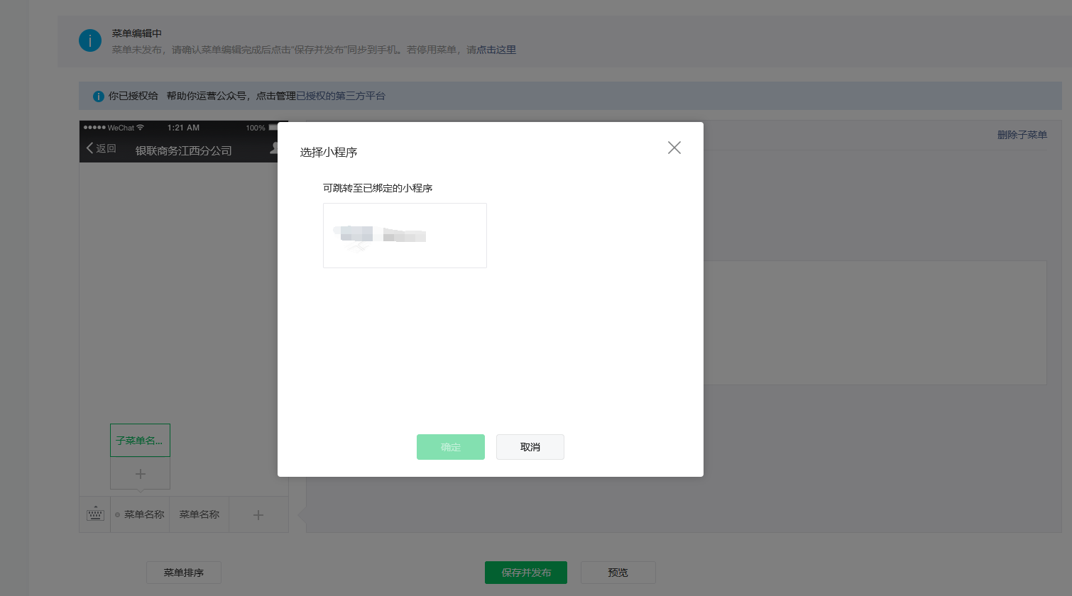 在自定义子菜单中如果要跳转小程序,需要先关联,如果你需要跳转别的小程序,你可以先关联小程序后再次设置