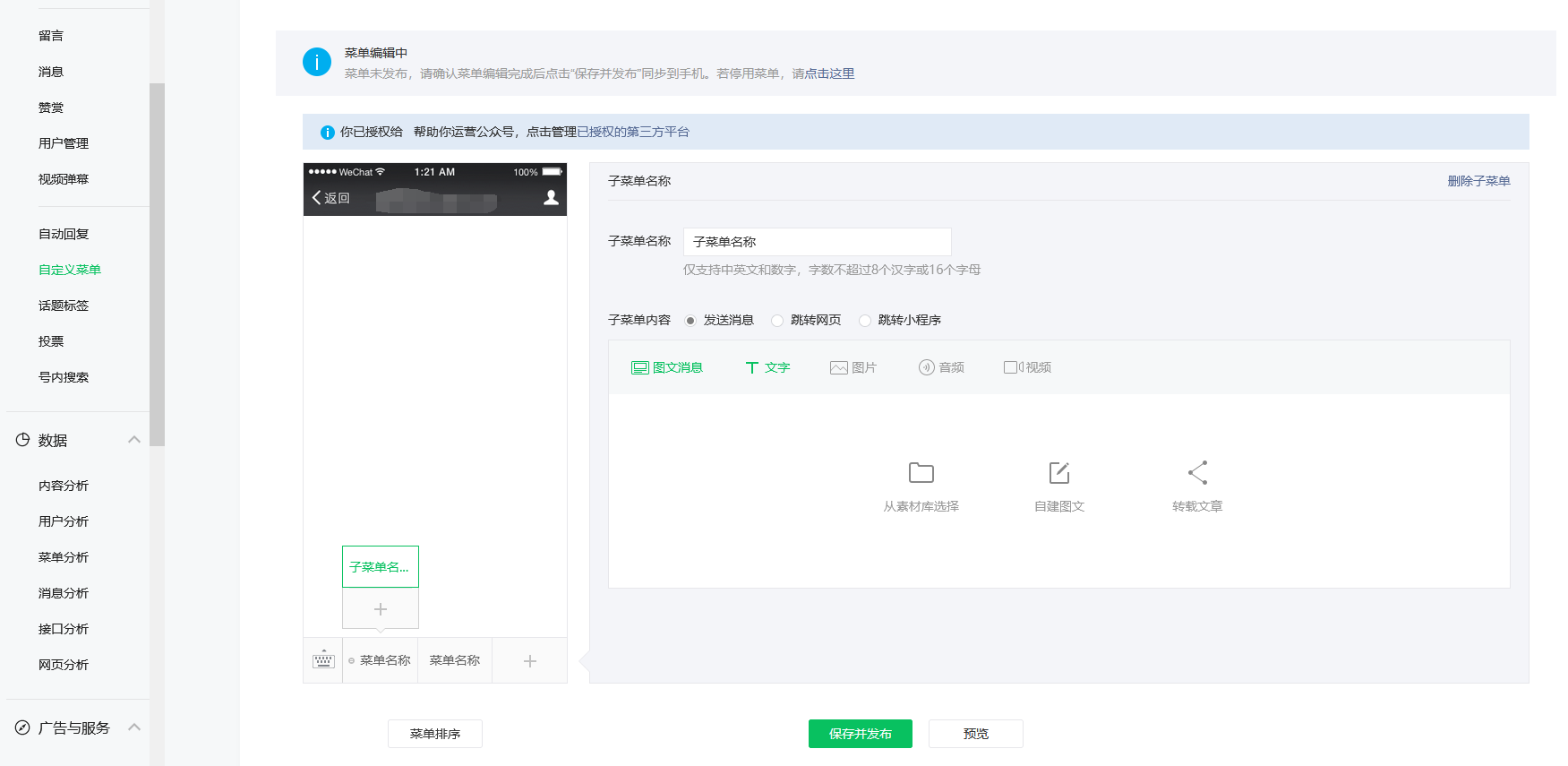 在微信公众平台上只能看到两个“菜单名称”的主菜单,和一个“子菜单名...”的子菜单。这是什么情况?