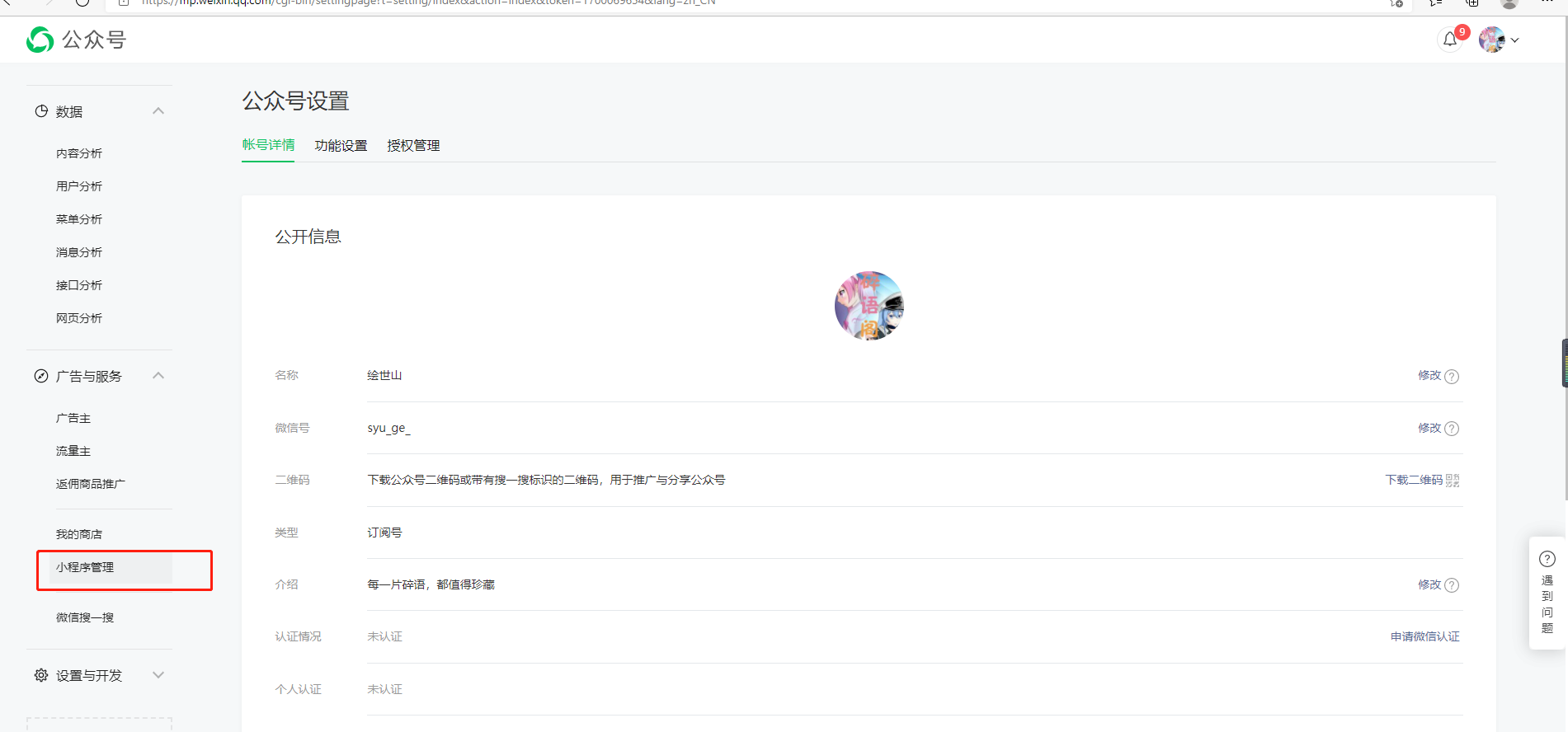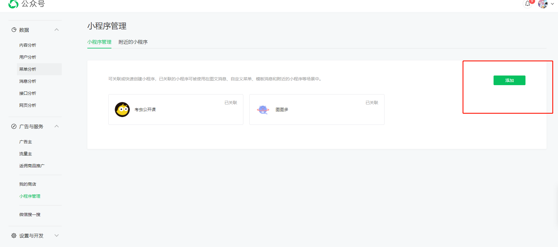 其中“商户服务”菜单还有四个子菜单,现在我想添加一个,在微信公众平台上登陆管理员的账号后,看到的界面是这样的