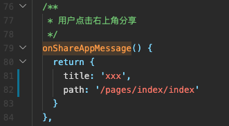 //正确写法如下: //写法一 onShareAppMessage(function () { return { title: '一个好用的科研管理平台,分享给你~', path: '/pages/index/index' } }) //写法二 onShareAppMessage(() => { return { title: '一个好用的科研管理平台,分享给你~', path: '/pages/index/index' } })