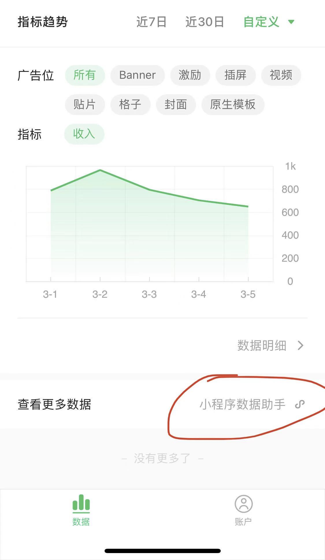 在流量主服务助手中,选择查看小程序账号,然后点击下面的查看更多数据,跳转到小程序数据助手,页面不存在。