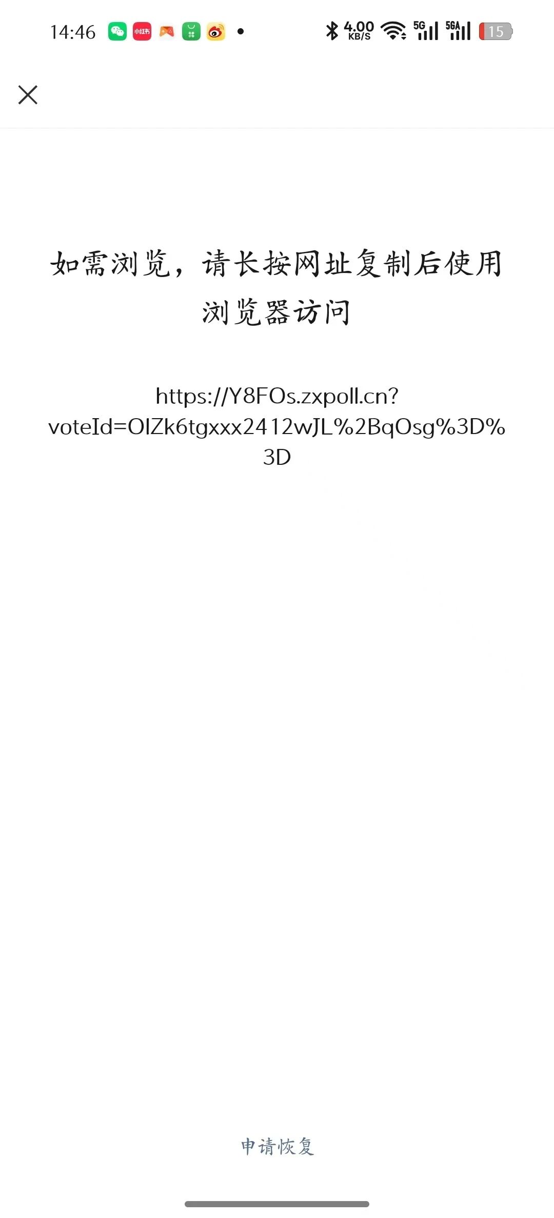 社区技术专员,你好,公司的网页(https://y8fos.zxpoll.cn/?voteId=OlZk6tgxxx2412wJL%2BqOsg%3D%3D),已完成ICP备案,也配置好了ssl证书,之前都是正常访问的,今天在微信内访问出现了“如需浏览,请长按网址复制后使用浏览器访问”提示,不能直接访问。查询网址说有恶意内容,但是页面没有恶意内容。请帮忙恢复正常访问,谢谢。