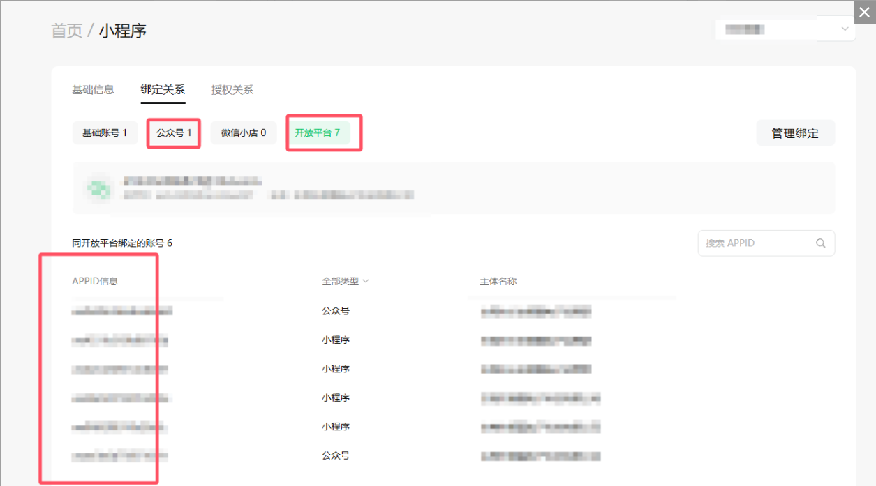 2、这个【绑定关系】的【开放平台】下的绑定账号建议与【公众号】下一样,在appid信息列增加小程序/公众号的昵称与头像。