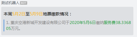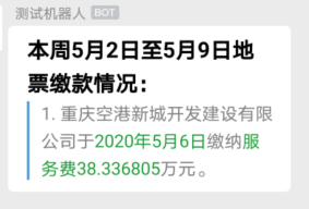 #### 本周<font color=warning>5月2日</font>至<font color=warning>5月9日</font>地票缴款情况:\n> <font color=comment>1. 重庆空港新城开发建设有限公司于</font><font color=info>2020年5月6日</font><font color=comment>缴纳</font><font color=info>服务费38.336805</font><font color=comment>万元。</font>