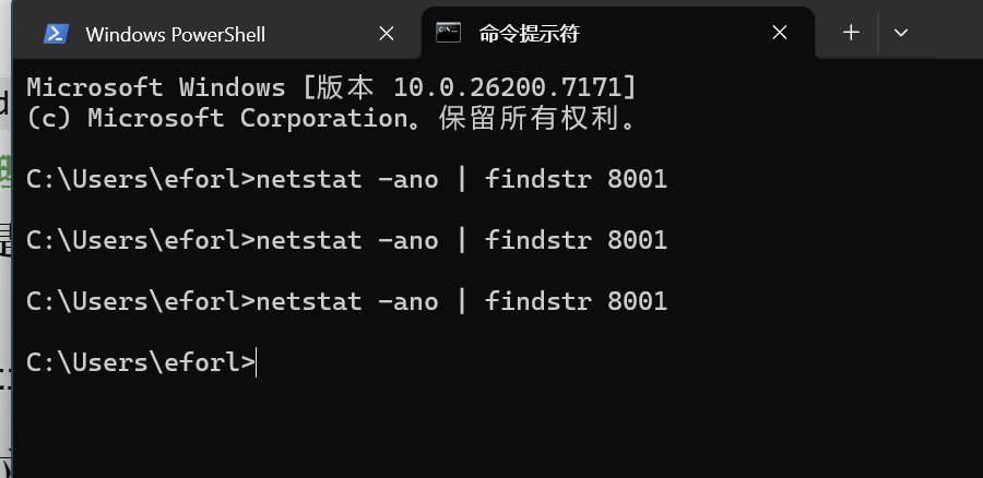 最后又更换了一台“干净”的电脑进行验证,该电脑从未安装过 WSL、Hyper-V、Docker、虚拟机或 VPN,系统和网络配置均为默认状态。在相同步骤下,问题完全一致,8001 端口始终未监听。
