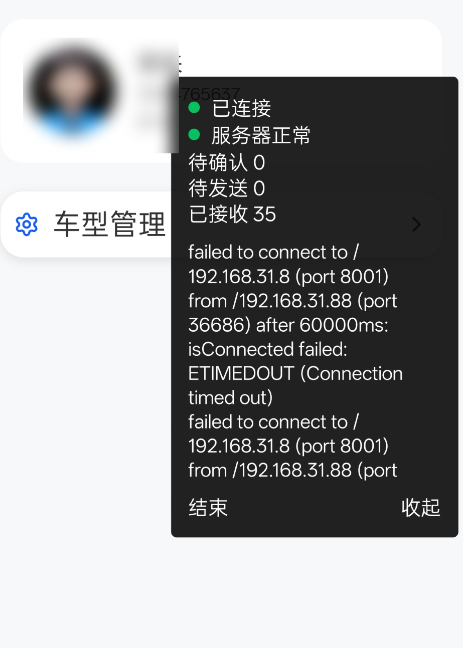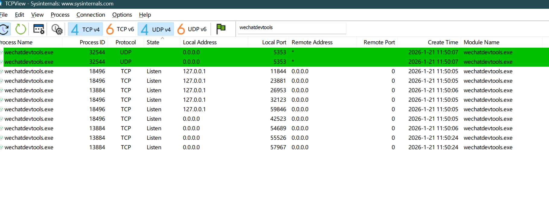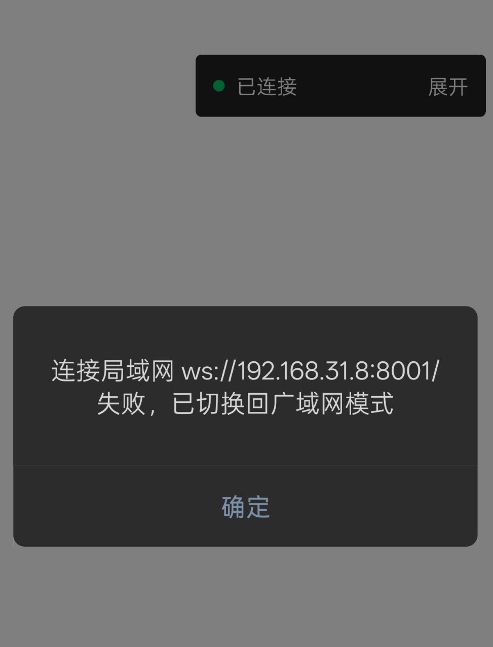 现象是:开发者工具能够正确识别本机的局域网 IP,手机与 PC 处于同一局域网环境。扫码后,手机会尝试连接 ws://<PC_IP>:8001,但最终始终提示“连接局域网失败,已切换为广域网模式”。在整个过程中,通过 netstat、TCPView、Get-NetTCPConnection 等方式反复确认,PC 端始终未观察到 8001 端口处于监听状态。