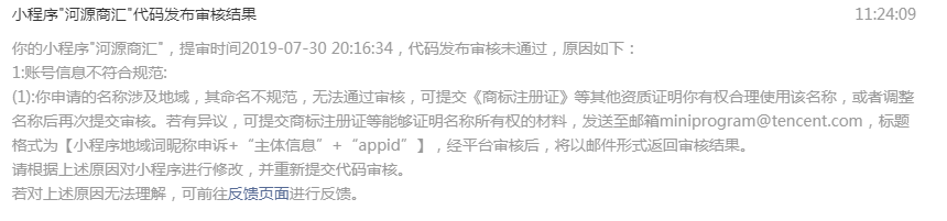 我的小程序名称,注册时通过了,用了一年半了就提示有地域名,这是几个意思,如果不让用,在注册时就应该不让注册成功。对于这种情况,官方就应该给个说法,最起码给我们一次《免费》修改小程序名称的机会