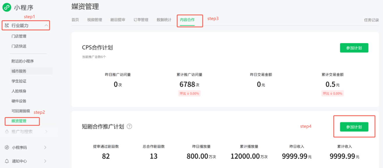 操作方式:链路小程序开发者进入「微信公众平台」,登录短剧小程序账号。点击”行业能力-媒资管理选择“内容合作”,参与”短剧合作推广计划"。