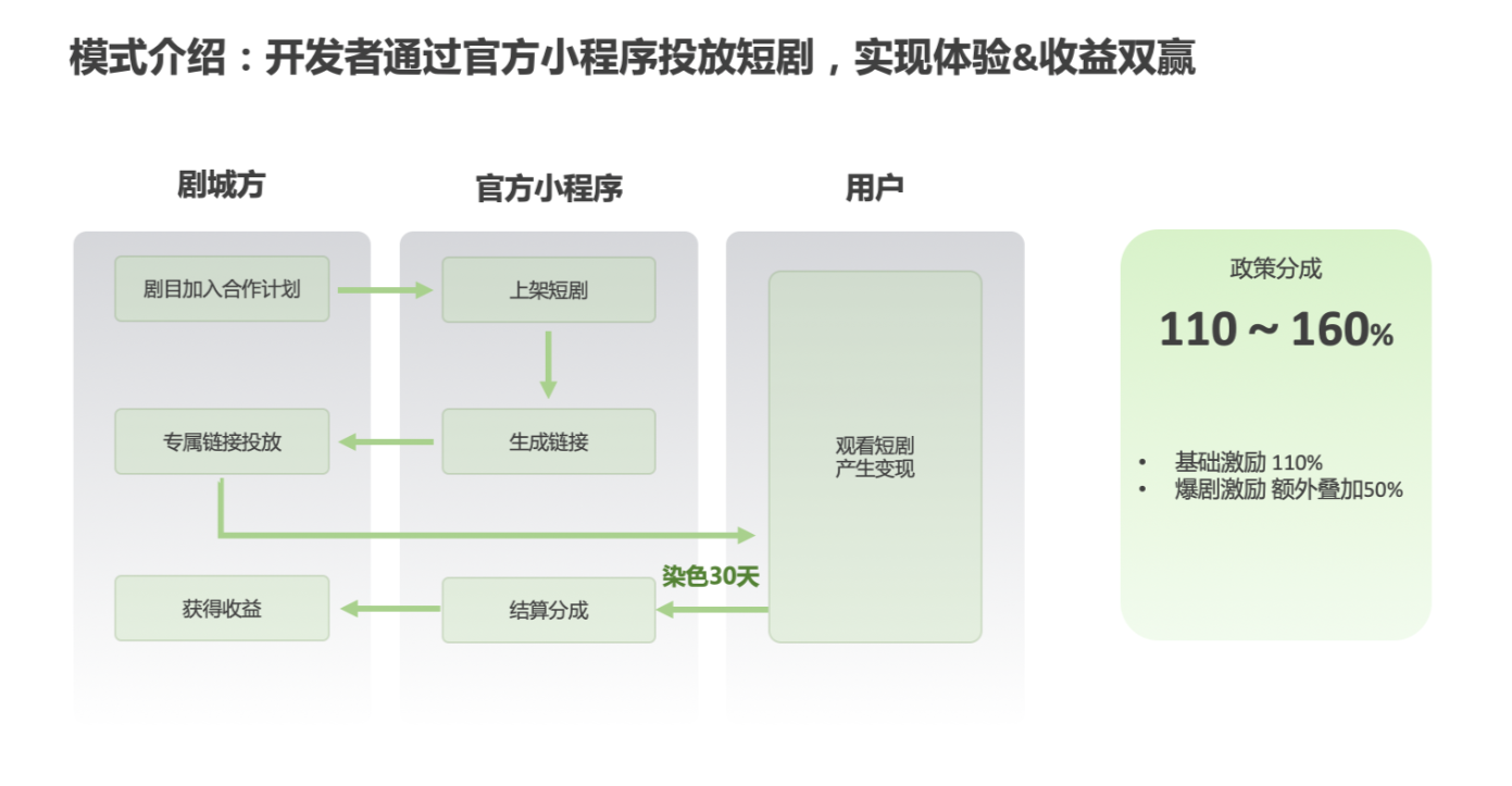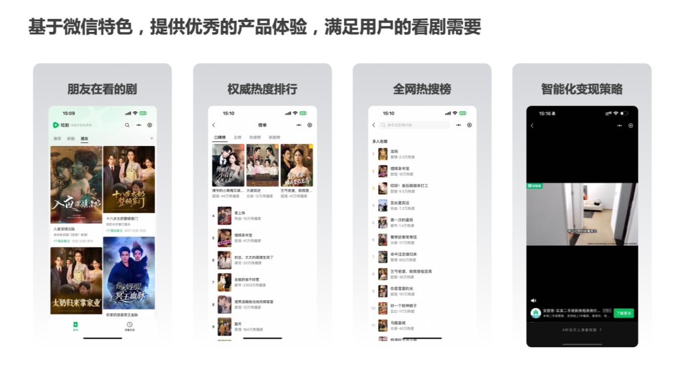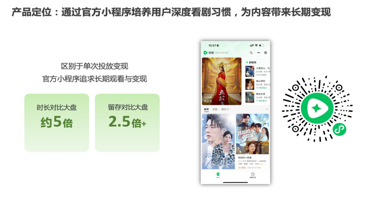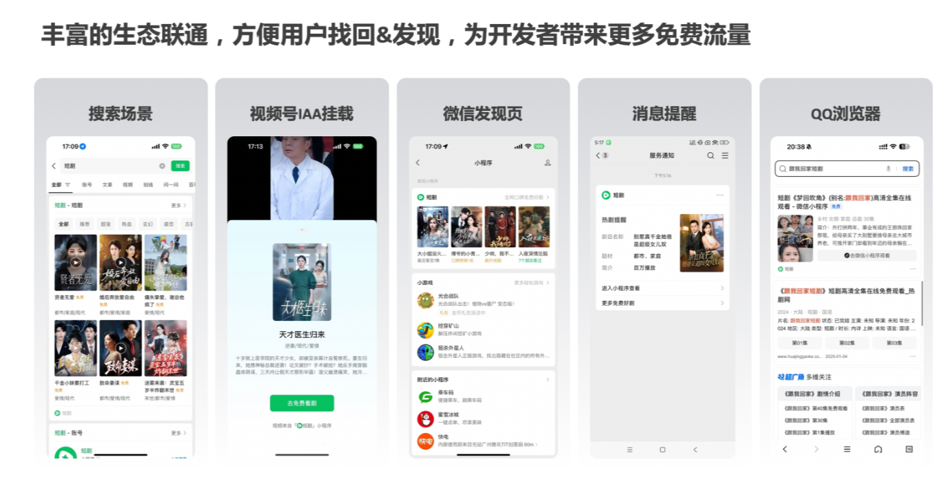 - 更好分发短剧:平台提供自然流量推荐,如发现页、搜一搜、消息视频号等更低经营成本:平台承担 CDN 成本、平台提供小程序能力,开发者更能聚焦流量&收入增长。