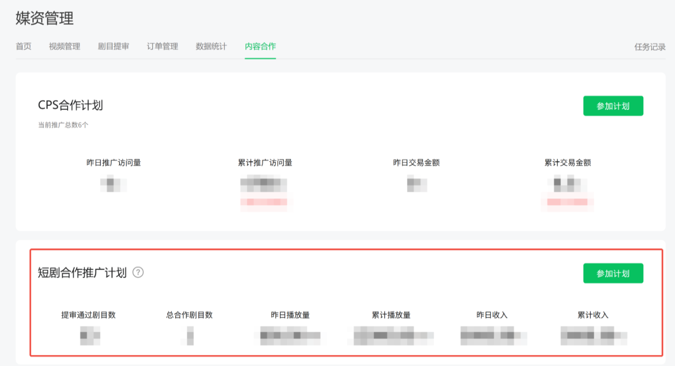 在内容管理-短剧合作推广计划,可以查看参与合作计划的剧目数、昨日播放量、累计播放量昨日收入、累计收入