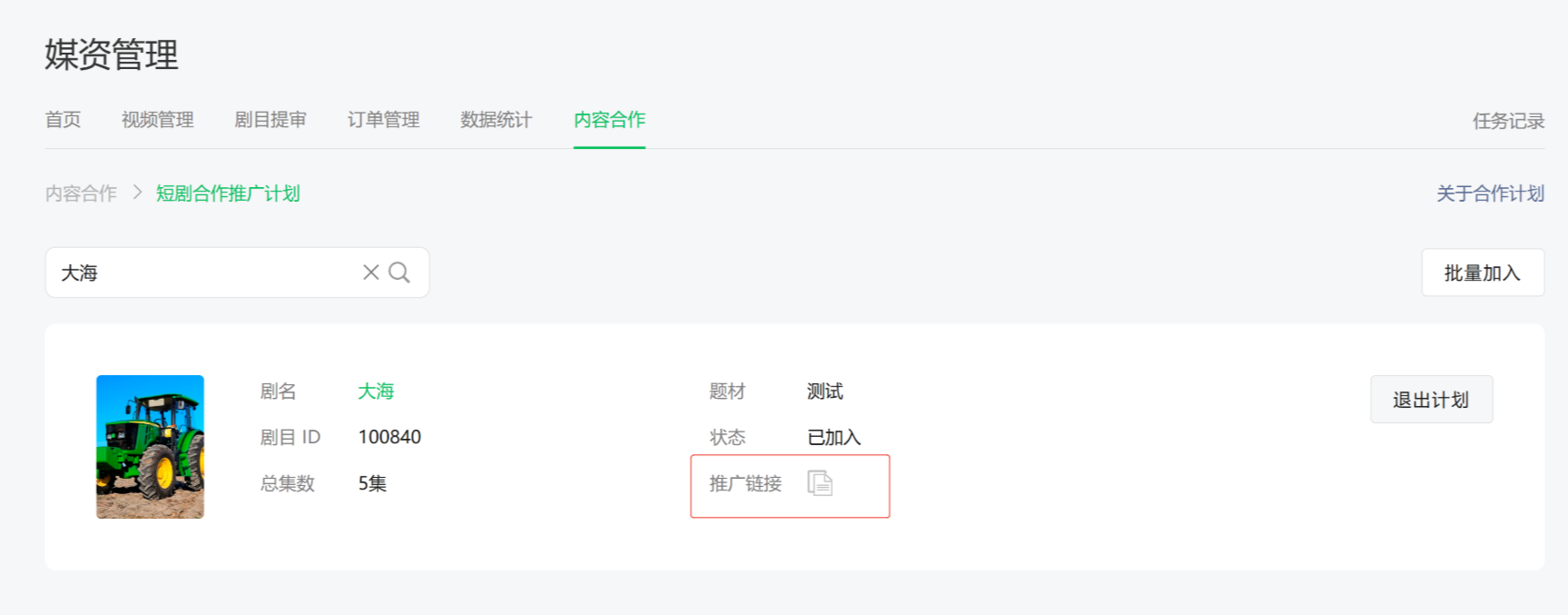 将剧目加入给短剧内容合作计划后,可以在「微信公众平台」后台,复制推广链接