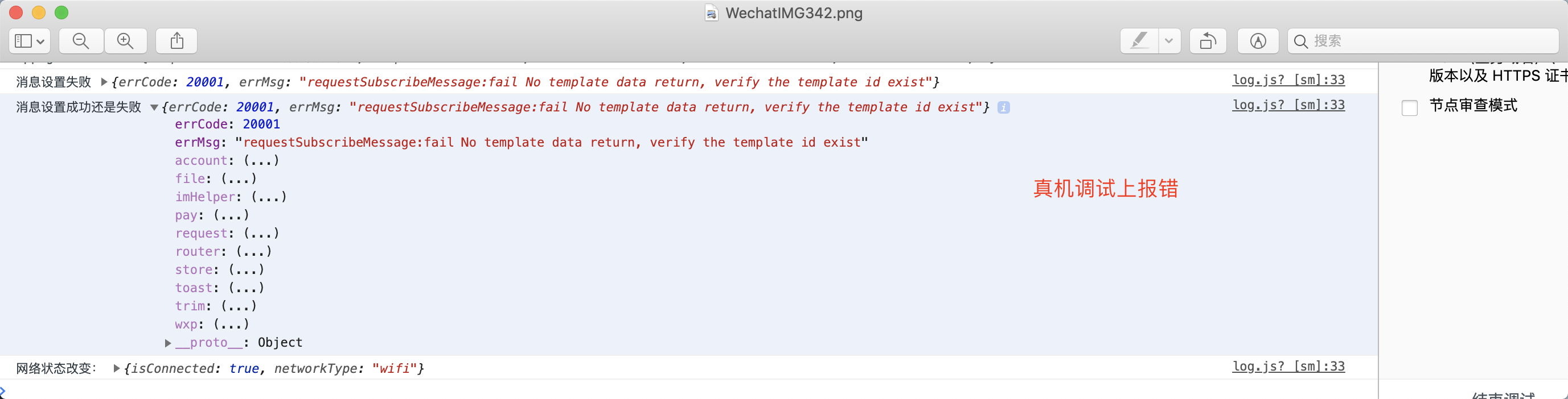 订阅消息,如下图,开发者工具上可以正常弹出,真机调试、体验版都不能弹出,请问会是什么原因?