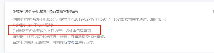 你好,经核实,贵方小程序实际所提供的服务属于尚未开放的服务类目内容:境外电信运营商,平台暂不支持,请重新定位小程序功能