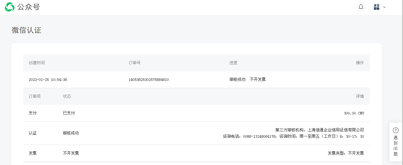 你好,我通过公众号操作了一单公众号认证,并且缴纳了300 元认证费,由于当时操作流程不清楚,选择了不开发票,现在需要开具相关发票公司进行报账应该如何处理
