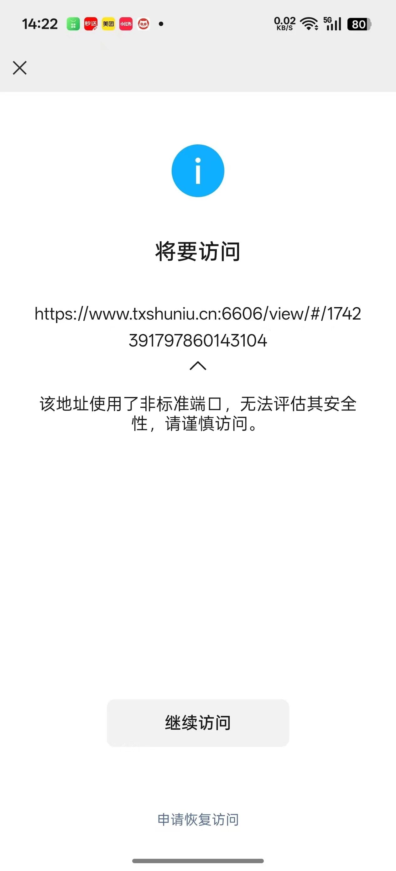 您好,该地址主要是提供给枢纽网站作地图导航使用,但是由于安全原因无法开通标准的443端口,故转由6606提供外部服务。这边也提交了几次恢复访问,但是无任何回复,而且目前访问地址依然弹出提醒窗口。麻烦协助处理。