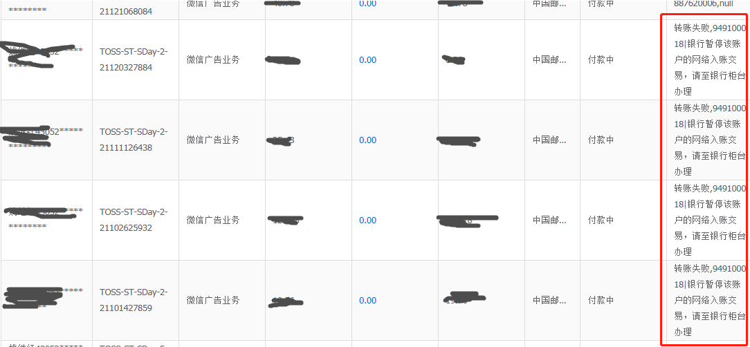 (转账失败,949100018|银行暂停该账户的网络入账交易,请至银行柜台办理) 这是后台显示的转账信息。