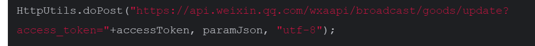 String requestResult = HttpUtils.doPost("https://api.weixin.qq.com/wxaapi/broadcast/goods/update?access_token="+accessToken, paramJson, "utf-8");