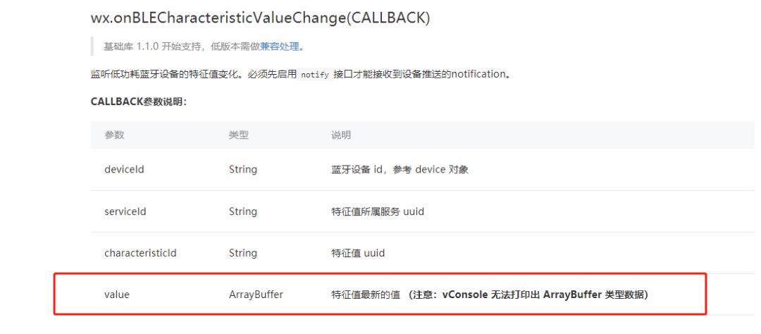 在监听特征值的回调参数有value 而readBLECharacteristicValue 的文档里没有这个字段,所以是文档又该更新了? 还有文档点左边目录右边滚动的位置不对,这个改改?