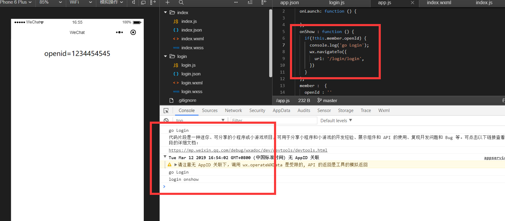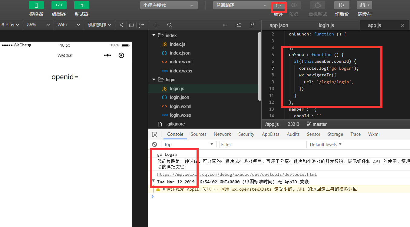 在app.js的onshow里面执行登录判断,如果未登录则跳转到登录页面,当直接点击“编译”按扭时,第一次会正常走登录页面,然后再清除缓存,清除console(有时候不必如此做),再次点击编译按扭则很大几率的情况会出现以下情况,如图一红框中的代码,if(!this.member.openId)结果为true,进入了条件分支,控制台打出了go Login的日志,但是接下来wx.navigateTo()不能跳转,反复点击编译也是一样,相同的情况在真机设备上有偶有出现,不会进行登录而进行到后续业务逻辑时因为没有登录而报错误。正常情况如图二,应该在打出go Login日志之后,跳转到登录页面login/login把登录方法里面设置的openid带过来设置到app的member属性之中。详情复现demo请参见代码片段,在本地开发者工具上已经复现此BUG。
