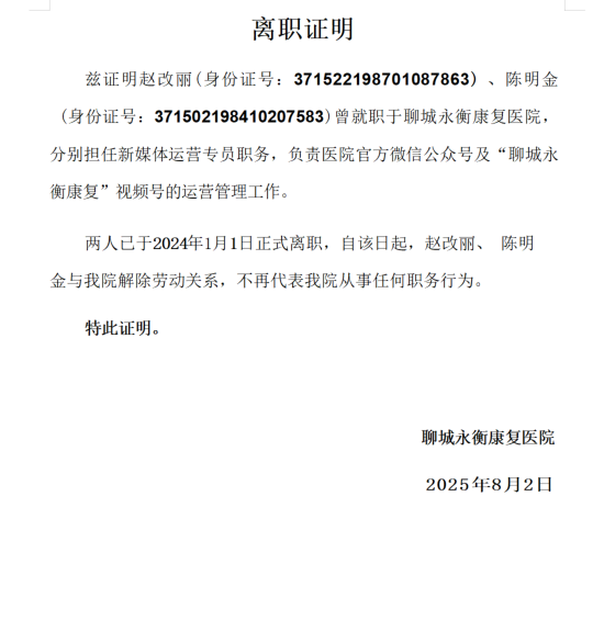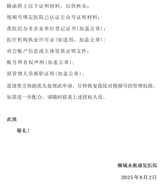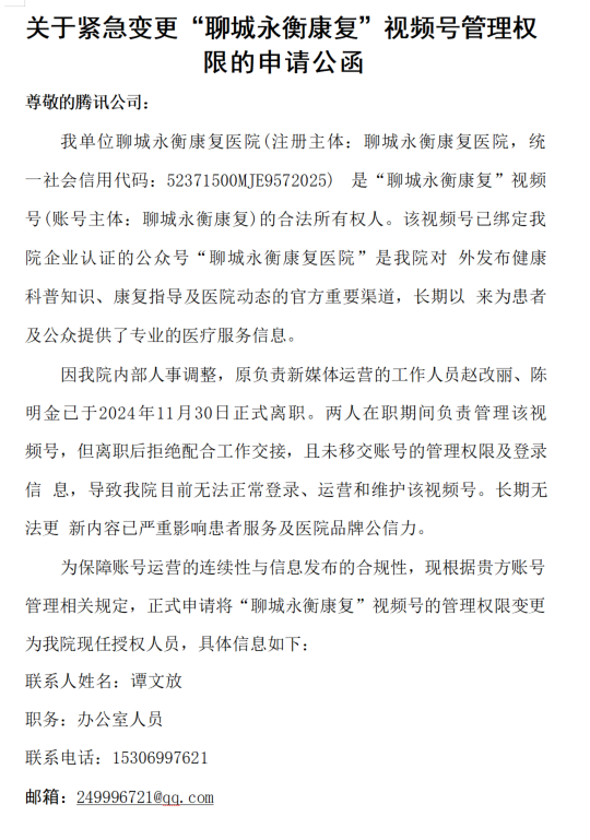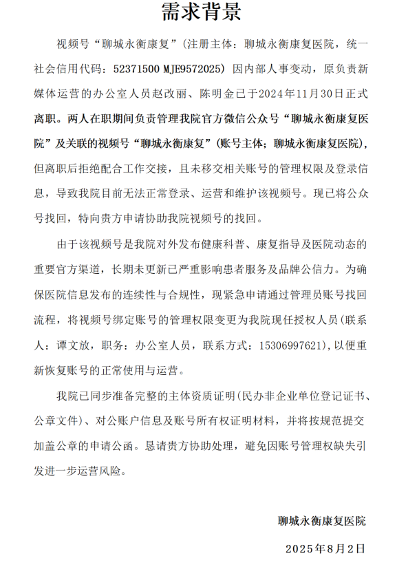 视频号“聊城永衡康复”(注册主体:聊城永衡康复医院,统一 社会信用代码:52371500 MJE9572025) 因内部人事变动,原负责新 媒体运营的办公室人员赵改丽、陈明金已于2024年11月30日正式 离职。两人在职期间负责管理我院官方微信公众号“聊城永衡康复医 院”及关联的视频号“聊城永衡康复”(账号主体;聊城永衡康复医院), 但离职后拒绝配合工作交接,且未移交相关账号的管理权限及登录信 息,导致我院目前无法正常登录、运营和维护该视频号。现已将公众 号找回,特向贵方申请协助我院视频号的找回。