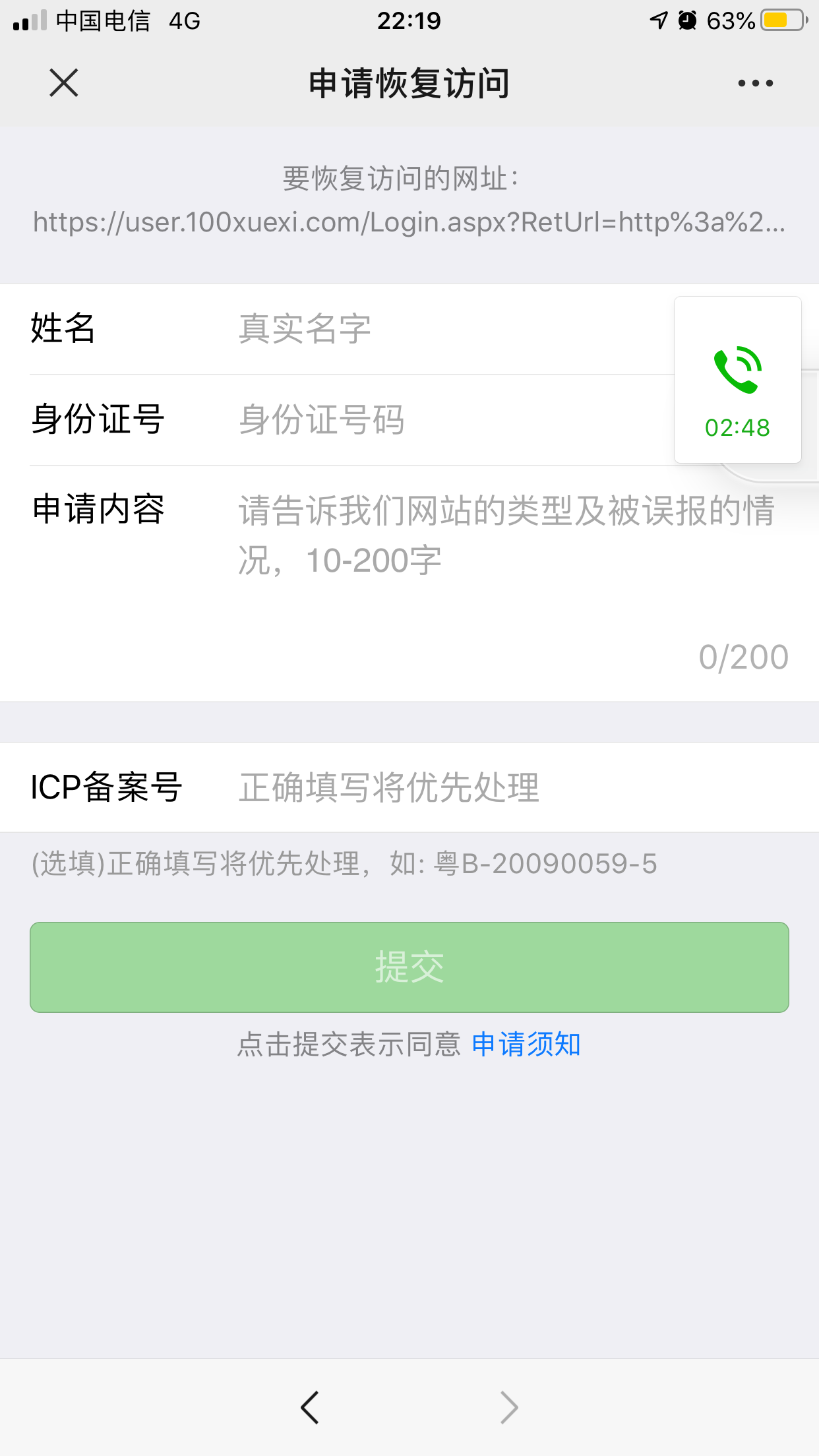 点击“申请恢复访问”,发现,被封的网址,居然是用户登录的网址: