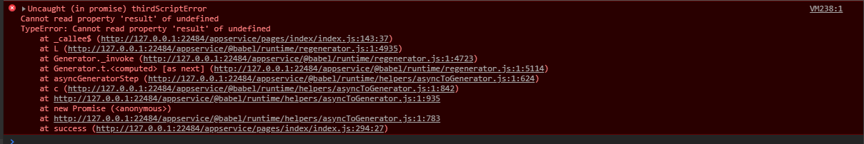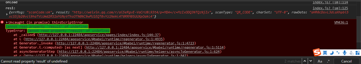 click: function () {wx.scanCode({success: async res => {var serial_num = res.result.substring(0, 16);let res = await DB.get()console.log("查询数据成功", res);for (var a = 0; a < 4; a++) {if (res.data[a].serial_no == serial_num) {await DB.where({serial_no: res.data[a].serial_no,}).update({data: {check_time: res.data[a].check_time + 1,},});scan_times = res.data[a].check_time + 1;console.log("Internal checked scan_times is ", scan_times);console.log(res);break;}}console.log(scan_times);scan_times = parseInt(scan_times) + 1;console.log(scan_times);}})}Cannot read property 'result' of undefined