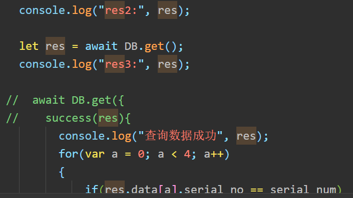 click: function () { // var that = this; wx.scanCode ({ success: async res => { console.log("res1:", res); var serial_num = res.result.substring(0, 16); serial_no = serial_num; console.log("res2:", res); let res = await DB.get(); console.log("res3:", res); // await DB.get({ // success(res){ console.log("查询数据成功", res); for(var a = 0; a < 4; a++) { if(res.data[a].serial_no == serial_num) { console.log("test"); //查询次数+1 await DB.where({ serial_no:res.data[a].serial_no, }) .update({ data: { check_time: res.data[a].check_time + 1, }, }); scan_times = res.data[a].check_time + 1; console.log("Internal checked scan_times is ", scan_times); console.log(res); break; } } // } // }) console.log(scan_times); scan_times = parseInt(scan_times) + 1; this.setData({ scan_times: this.scan_times, }) }, }) },是啊,异步问题,那就放在里面赋值呗,不要拿出来赋值。