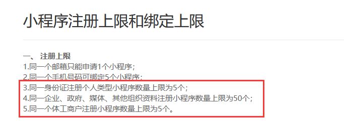 个人主体小程序与非个人主体注册数量上限无关联。