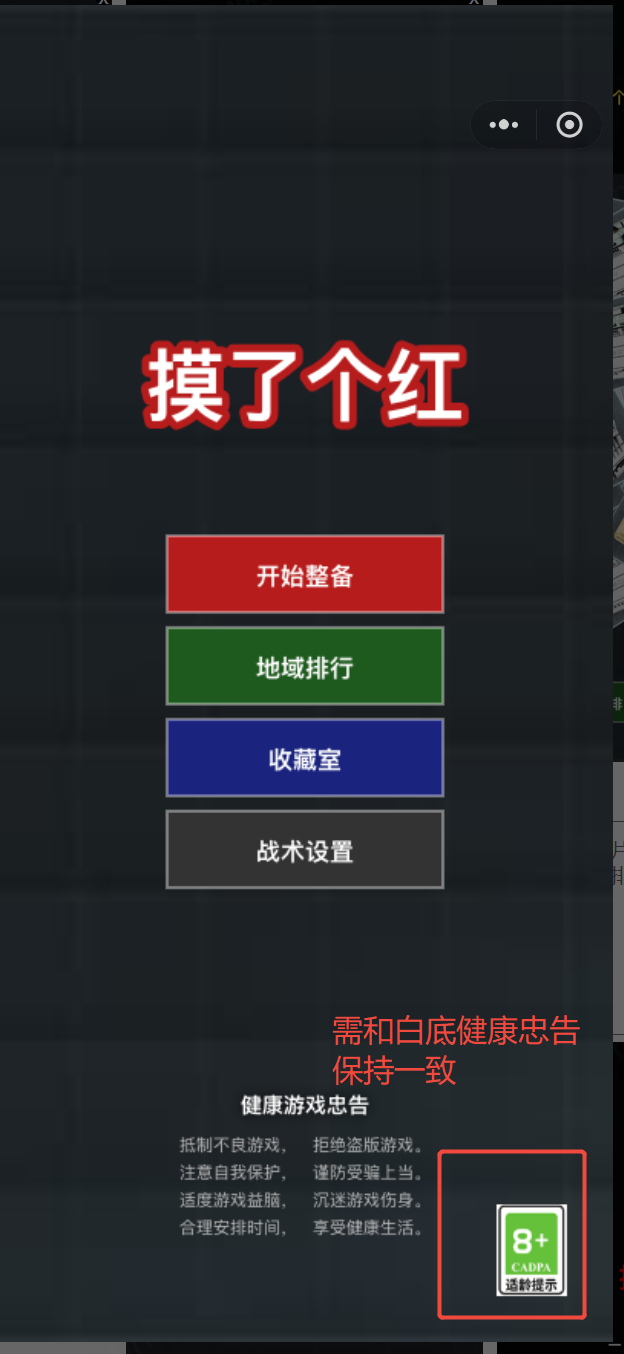 保险起见建议把页面做成黑白两块,下半部分改成白底黑字的健康忠告,外加这张白底的适龄提示。如果一定要黑底白字,估计适龄提示也要做成黑底白边白框,但这个在规范文档中并没有提到过。
