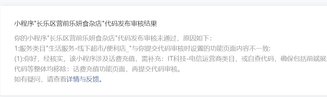 提示说小程序涉及网上营业厅,话费充值服务,仔细查看几天并没有话费充值,只是普通的便利店商城,不知道哪里出现话费充值。小程序主页面如下,没有什么隐藏的充值页面,烦请再次确认是否审核问题,如果是请提供具体问题原因,以便调整,目前已自查多次,都没用审查结果中反馈的话费充值功能页面,小程序中也没有添加快速购买页面,只是模板相似,是否看错商城,比较急,麻烦尽快处理: