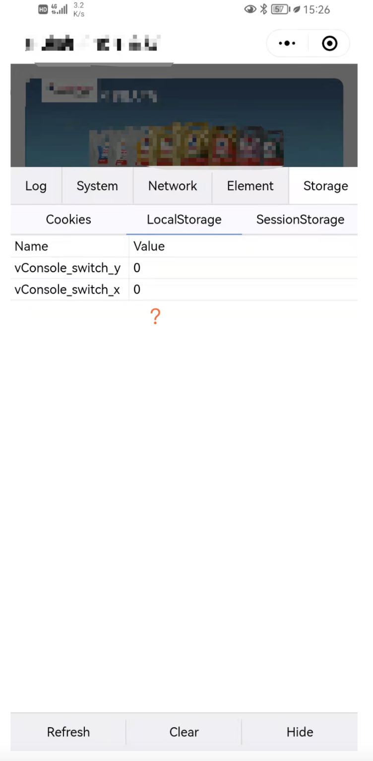 step2、重启小程序,页面初始化好之后,直接打开vconsole,查看结果,发现为空(如果有值,那再重启一次即可)
