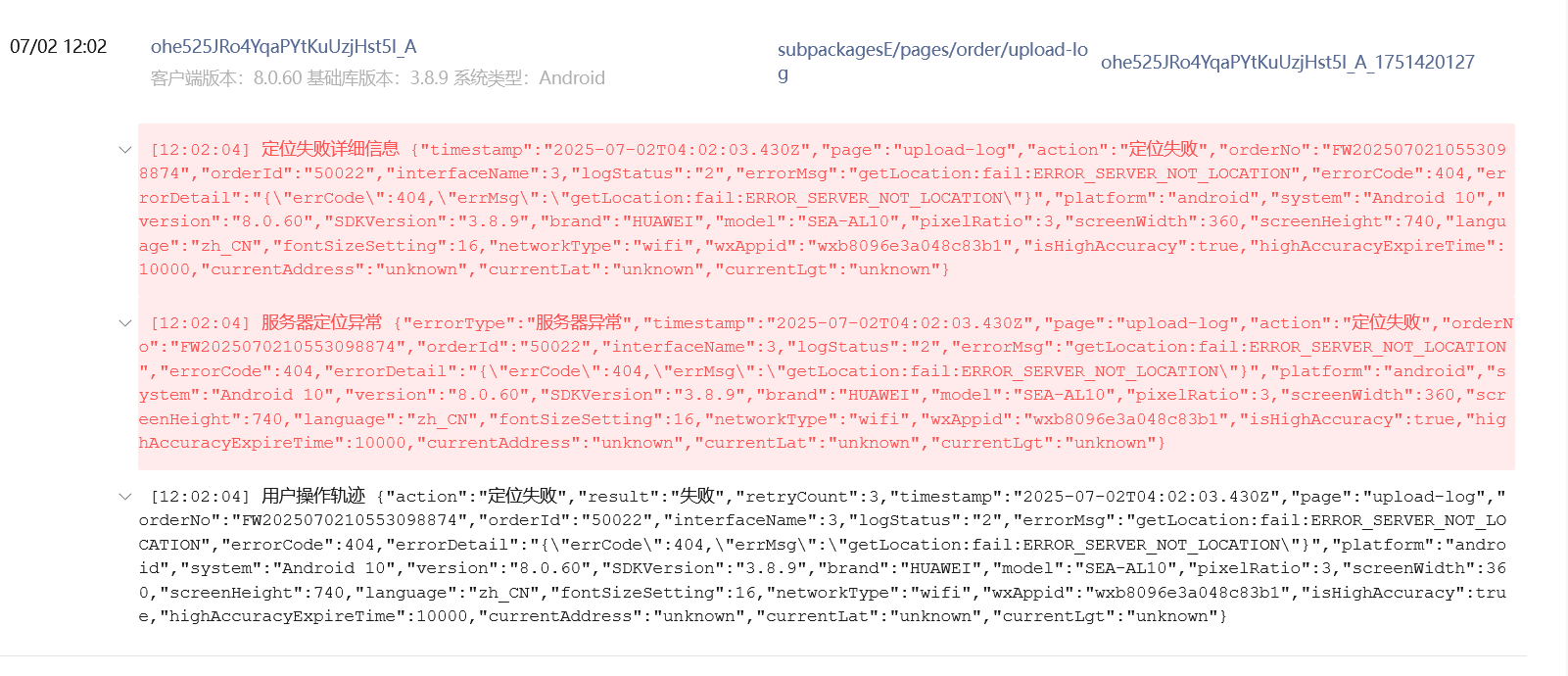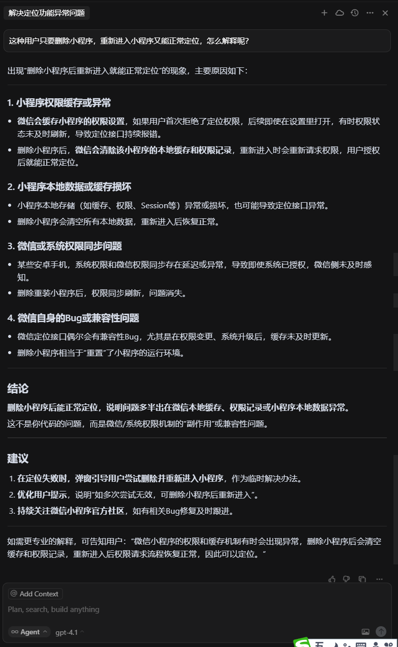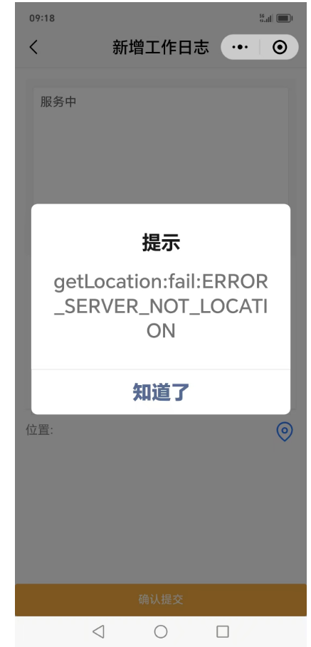 有部分用户反馈,使用获取当前高精度位置时(wx.getLocation),会遇到这个异常提示getLocation:fail:ERROR _SERVER_NOT_LOCATI ON ,这个是什么原因导致的呢? 这部分用户删除小程序后重新操作又能正常获取定位不报错。 问题不好重现,到底有多少种错误码官方也不说清楚,一个fail失败函数都没有一点儿资料说明。https://developers.weixin.qq.com/minigame/dev/api/location/wx.getLocation.html