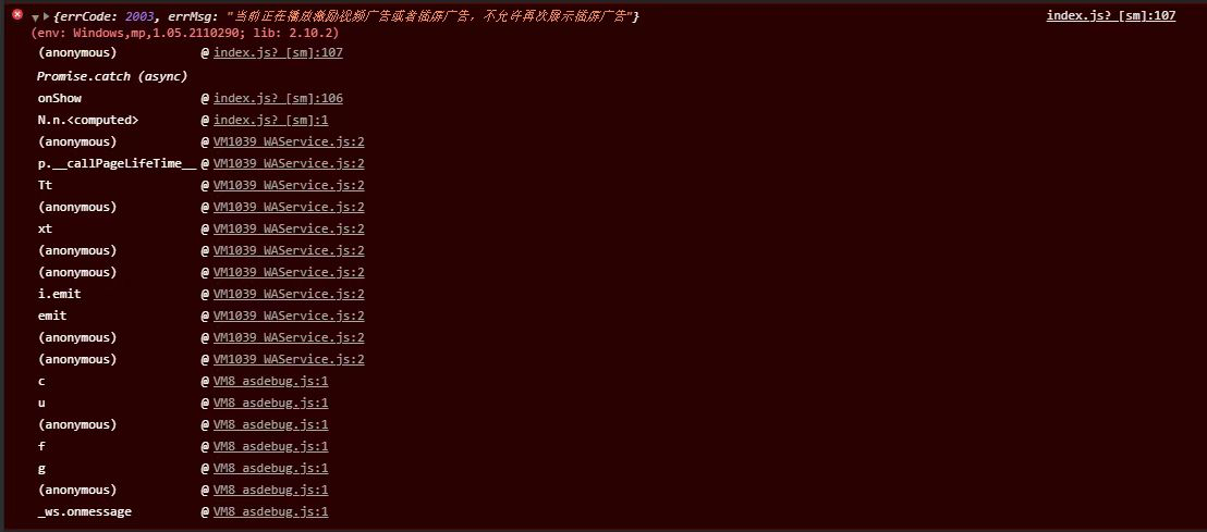 小程序插屏广告存在bug,首次进入首页,显示调用成功,但是没有正常显示广告,切换城市之后会再次进入首页,会显示已经 当前正在播放激励视频广告或者插屏广告,不允许再次展示插屏广告,报错2003