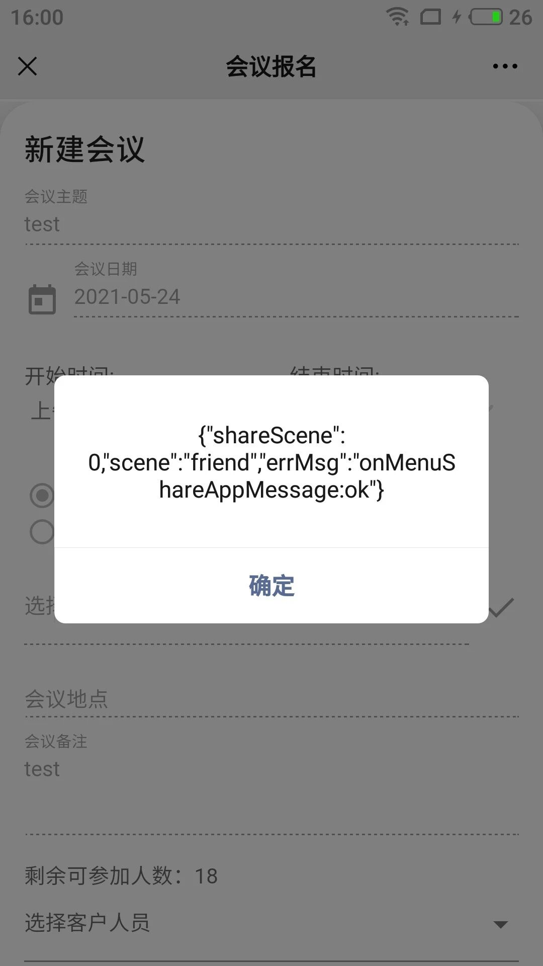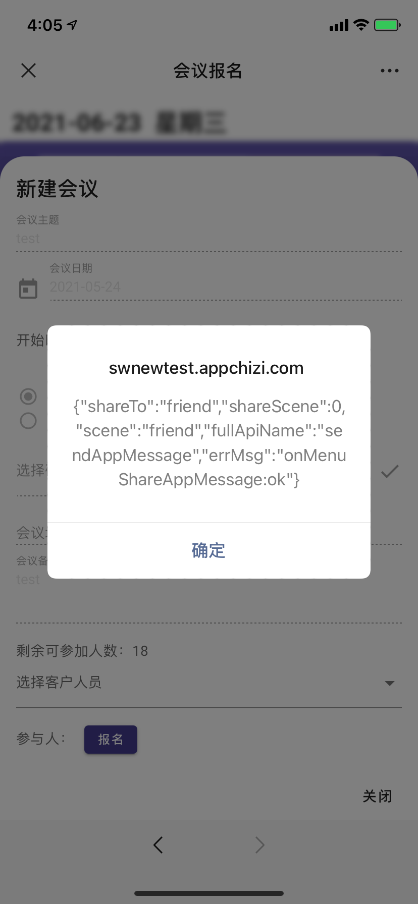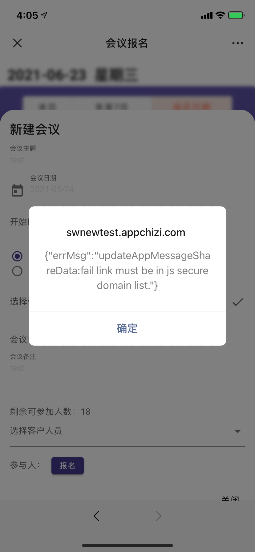 场景三,iOS端微信(iPhone 11,微信版本8.0.7)分享,在配置成功后,调用updateAppMessageShareData,报错:“ fail link must be in js secure domain list.”。选择对话分享后,显示调用onMenuShareAppMessage成功。但是聊天界面上没有自定义分享效果。如图: