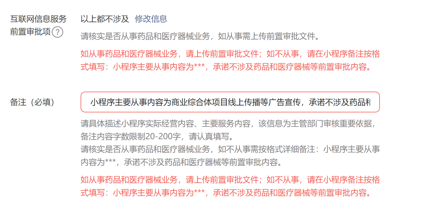 你好,请直接按备注格式进行填写,请复制粘贴以下:【小程序主要从事内容为***,承诺不涉及药品和医疗器械等前置审批内容。】。并自行补充带星号内容。