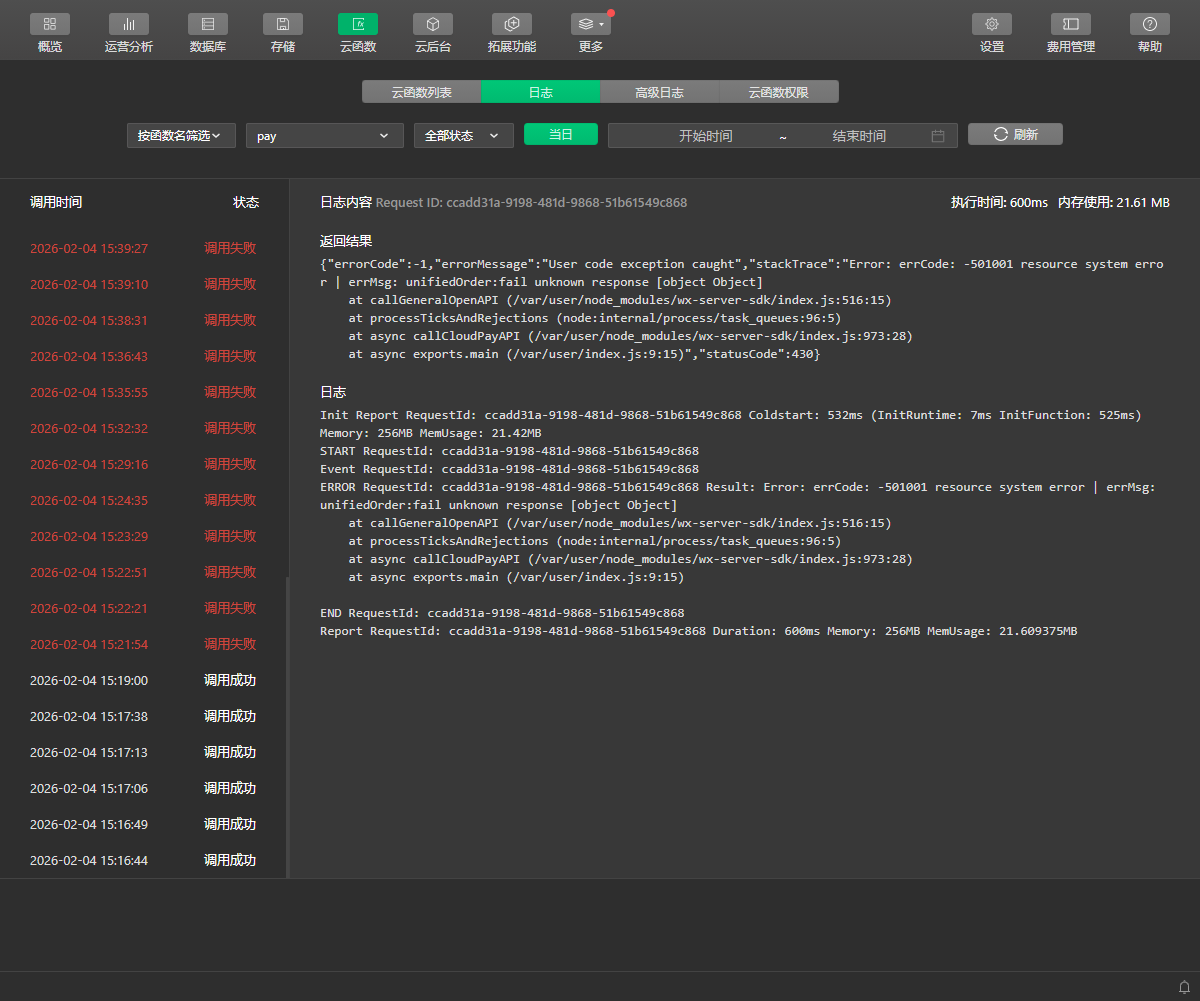 调用云开发的支付接口,查看云函数的执行日志,同样的代码,原先云函数调用成功,后面一直执行失败,该怎么解决?