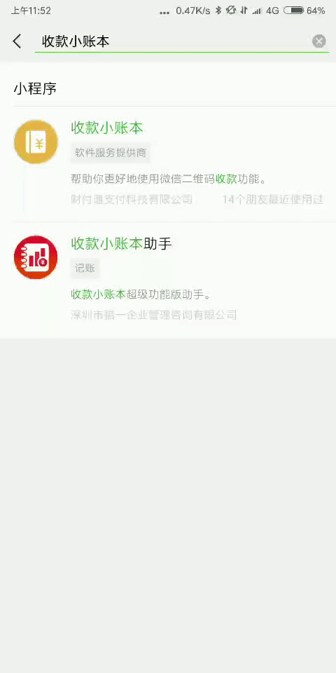 我们以工具类榜单第一的收款小账本为例,搜索这个小程序会出现两个结果,