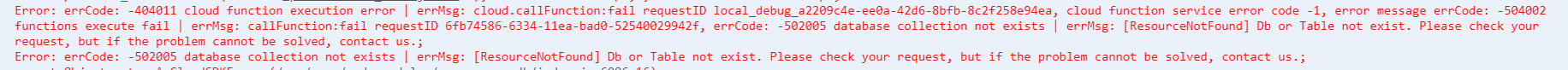 Error: errCode: -404011 cloud function execution error | errMsg: cloud.callFunction:fail requestID local_debug_a2209c4e-ee0a-42d6-8bfb-8c2f258e94ea, cloud function service error code -1, error message errCode: -504002 functions execute fail | errMsg: callFunction:fail requestID 6fb74586-6334-11ea-bad0-52540029942f, errCode: -502005 database collection not exists | errMsg: [ResourceNotFound] Db or Table not exist. Please check your request, but if the problem cannot be solved, contact us.;