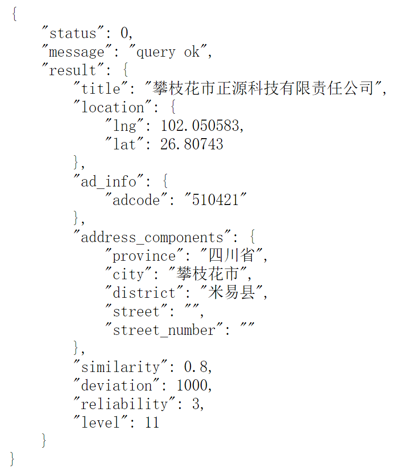 {"status": 0,"message": "query ok","result": {"title": "攀枝花市正源科技有限责任公司","location": {"lng": 102.050583,"lat": 26.80743},"ad_info": {"adcode": "510421"},"address_components": {"province": "四川省","city": "攀枝花市","district": "米易县","street": "","street_number": ""},"similarity": 0.8,"deviation": 1000,"reliability": 3,"level": 11}}