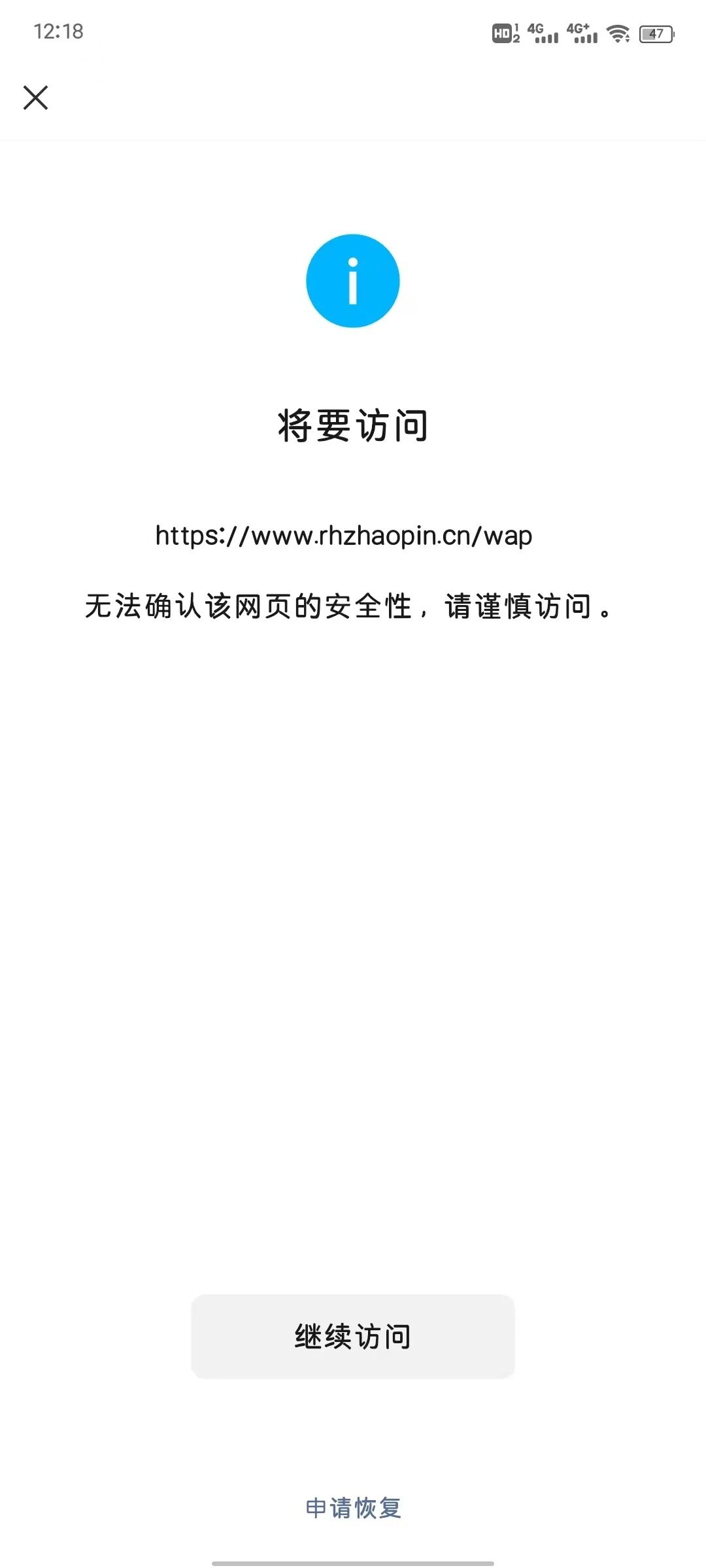 您好,域名(www.rhzhaopin.cn),网站浏览器访问正常,我是网站开发者,访问时间如图2025/05/09,微信访问网站出现“无法确认该网页的安全性,请谨慎访问”,经检查网页里没有不安全的内容,请核实后帮忙解除拦截,谢谢!