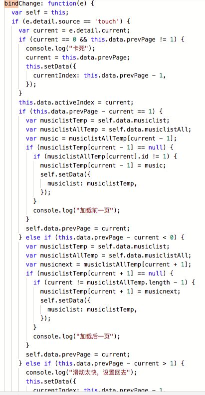 这是崩溃的那一页的bindchange,musiclistAll是一次性加载的数据,musiclist是一个长度和musiclistAll一样