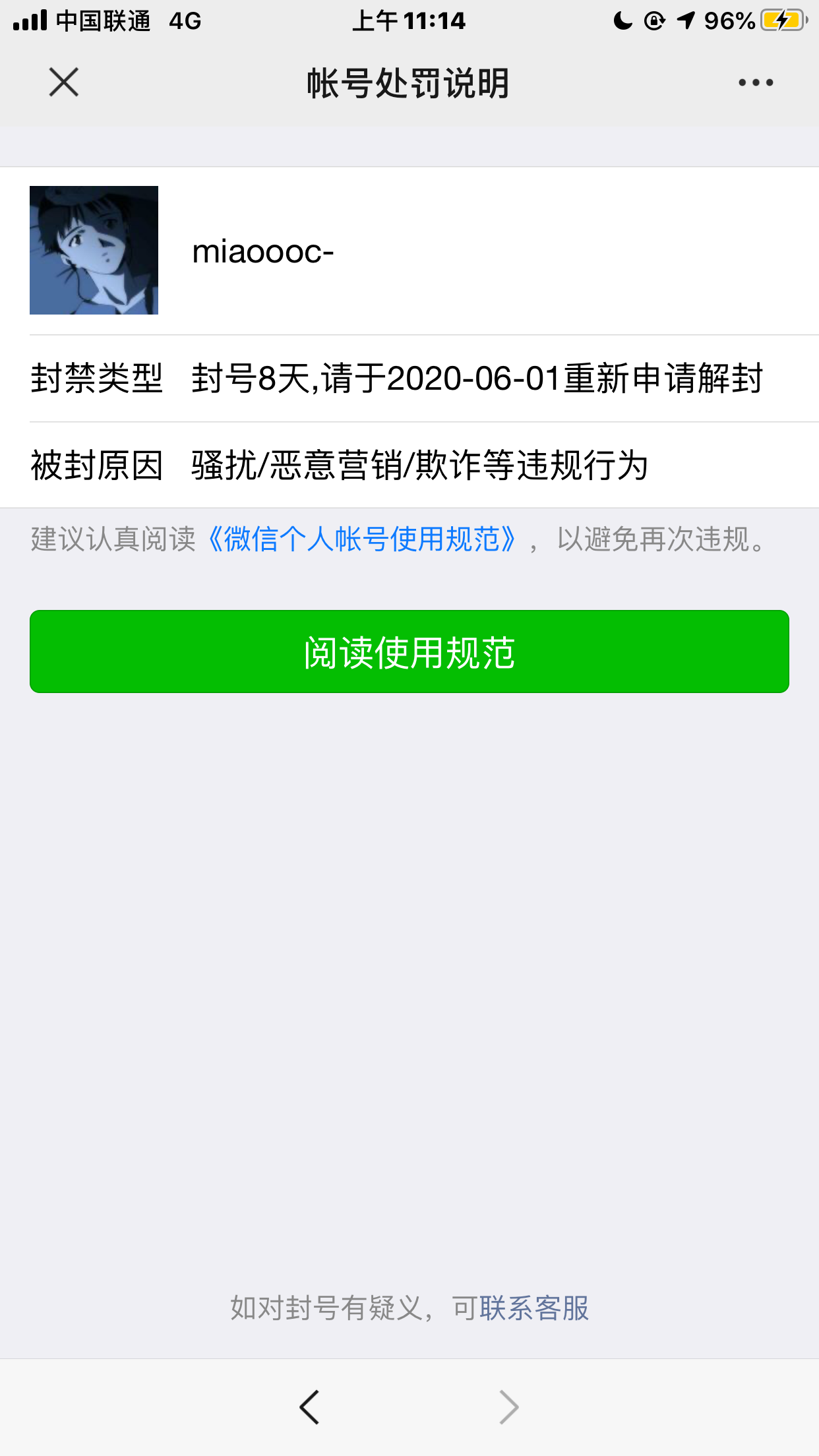 微信一直从事互联网工作,客户来源网络上或者游戏里面,联系了客户再添加到微信转账交易,从来都是正常营销,就在今天早上10多点添加了一个客户收了款之后,就被封号8天了,结果这个客户想再找我合作的时候一直联系不上我,我这个微信号一直守法经营,而且都是小额交易,小本经营不容易,为什么却这么容易被封号,希望可以重新查证。