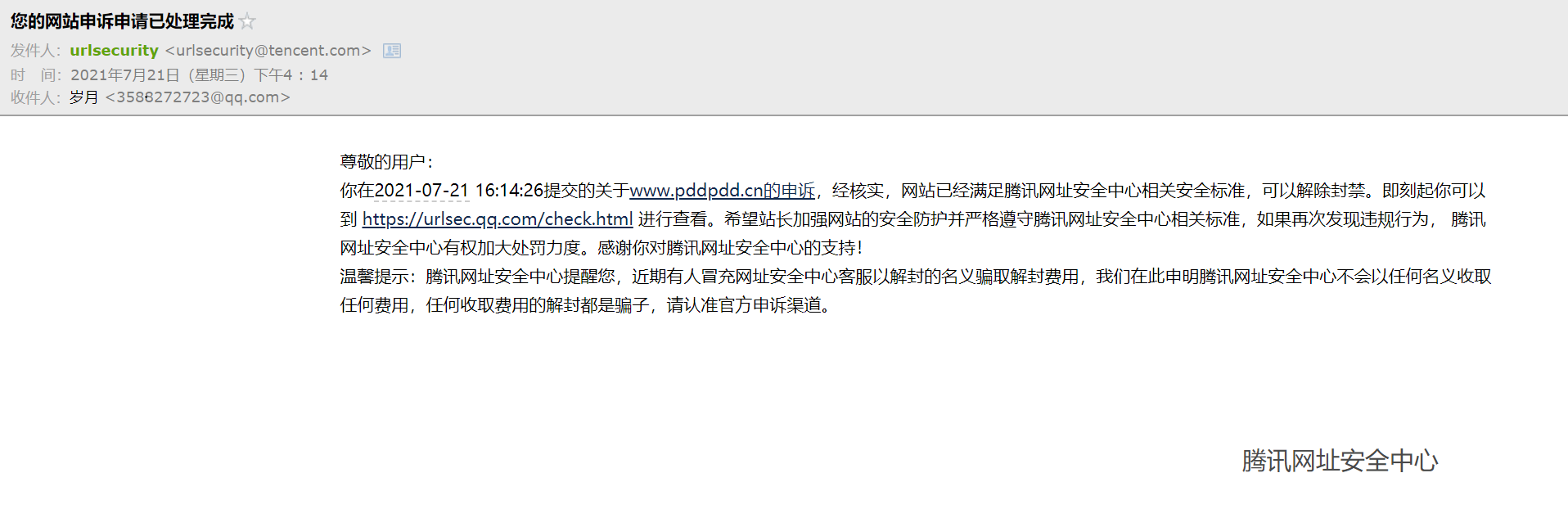 网站拦截申诉被驳回,原因“站下存在涉黑链接”,但此域名网站下并无涉黑涉黄网页,也没有违反腾讯其他规定。麻烦再次核实予以解封。