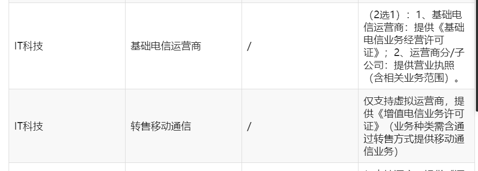 | IT科技 | 基础电信运营商 | / | (2选1):1、基础电信运营商:提供《基础电信业务经营许可证》;2、运营商分/子公司:提供营业执照(含相关业务范围)。 |
