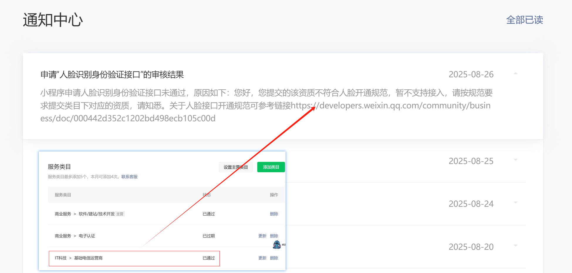 同一主体下申请了两个小程序,服务类目都已认证“金融业-银行”,两个小程序同时申请人脸识别接口,一个申请过了,另一个申请被拒绝了并提示资质不符合类目范围,请帮忙查看